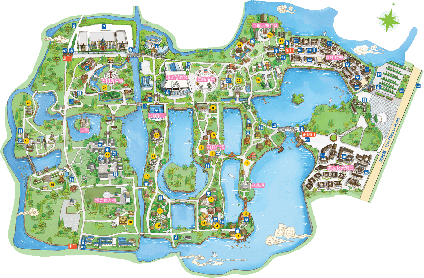 佤族人口約36萬,主要聚居在云南省瀾滄江南段以西的阿佤山區(qū)。佤族寨位于“翠漪洲”東南角。寨內(nèi)分布有茅草頂?shù)母蓹谑浇ㄖ骸⑴n^廣場(chǎng)、神靈廣場(chǎng)、司崗里石雕以及糧倉等。牛頭廣場(chǎng)是佤族古老的剽牛活動(dòng)場(chǎng)所,場(chǎng)正中的牛角為佤族的寨樁,廣場(chǎng)前的兩個(gè)石人分別為佤族的男性和女性祖先。神靈廣場(chǎng)表現(xiàn)了佤族萬物有靈、靈魂不死的自然崇拜觀念。場(chǎng)中兩個(gè)石人雕像分別為佤族最崇拜的“木依吉”和“阿依娥”。佤族木鼓舞節(jié)拍鮮明強(qiáng)烈,...